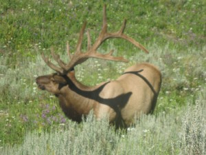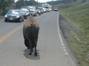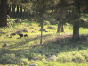 At first I said “naw, that’s just a bison away from the heard” but then it moved and I fumbled for a flashlight. I lit up the bear and we saw his eyes staring right back at us (it was dark so we couldn’t tell if he was looking at us for our leftovers or as dessert). After a moment he turned and disappeared over the ridge. With a curt “we will clean up later” I threw the rest of the dishes in the back of the Beast and we jumped in comforted by the safety of the vehicle. It was quite dark as we returned to our hotel and Rangel was bouncing out of her seat talking about the bear when she said “STOP… FOX… I MEAN WOLF!” Sure enough, a rare large black and silver wolf was jogging down the road. A pack had been reintroduced into the park in 1995 and there are about 2o0 now. That’s 200 in 2.2 million acres. It looked the wolf from the Little Red Riding Hood story, large sharp teeth and all. We turned around and saw him cross the road to return to his den after a day of hunting in the valley. We had been in the park less than three hours and had seen two of the rarest animals in the park. I know, unbelievable.