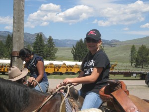 We stopped at the Roosevelt Lodge and rode horses in a large open valley. Rachel rode Peter and Shrek carried me.