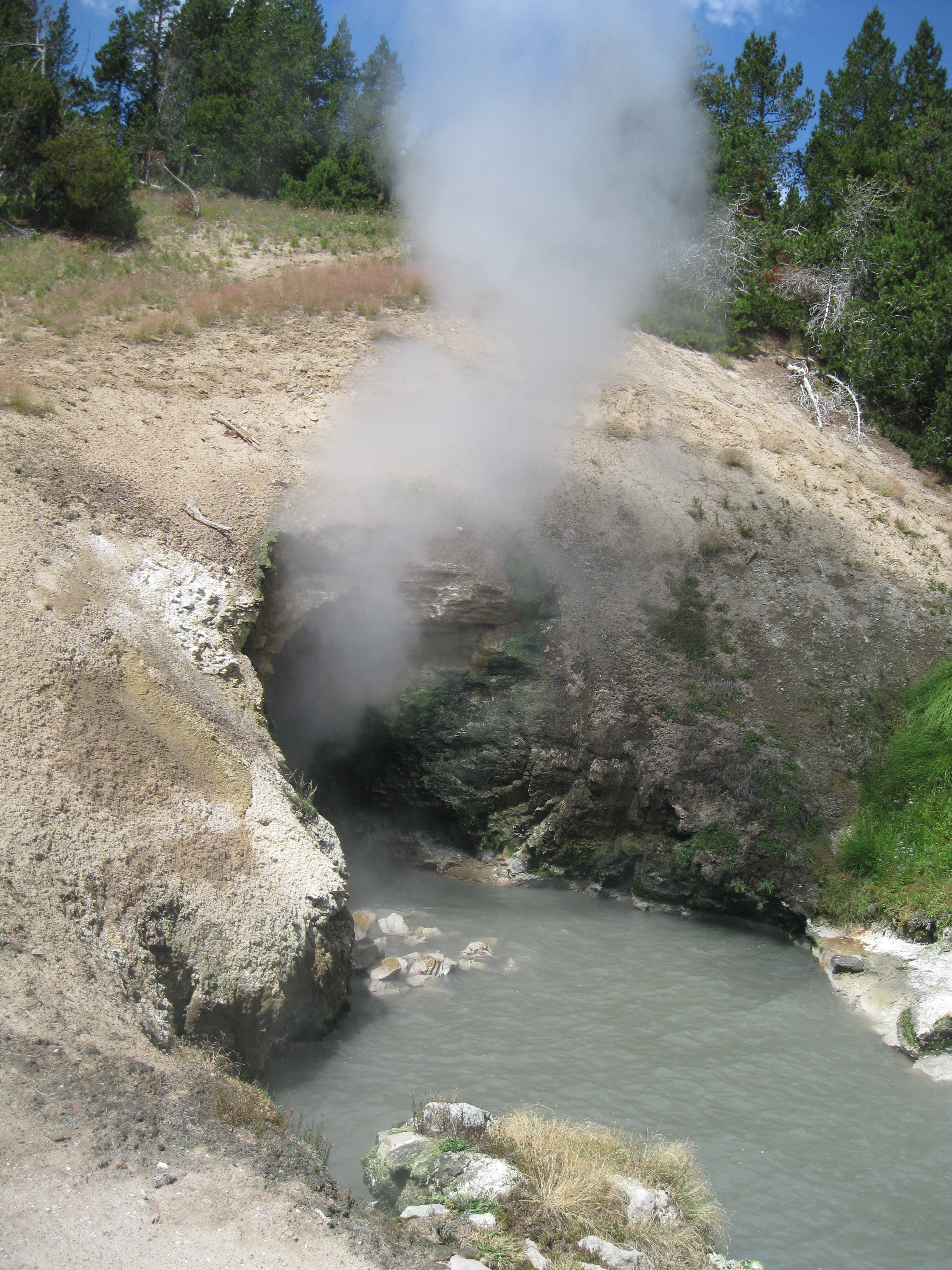 We set up camp at the Mammoth Springs campground and headed back to the springs. We soaked for two hours in hot springs mixed with river water in the cold rain moving from hot spring water to cold river water in seconds. Again, we have to thank Maggie for this very special memory.
